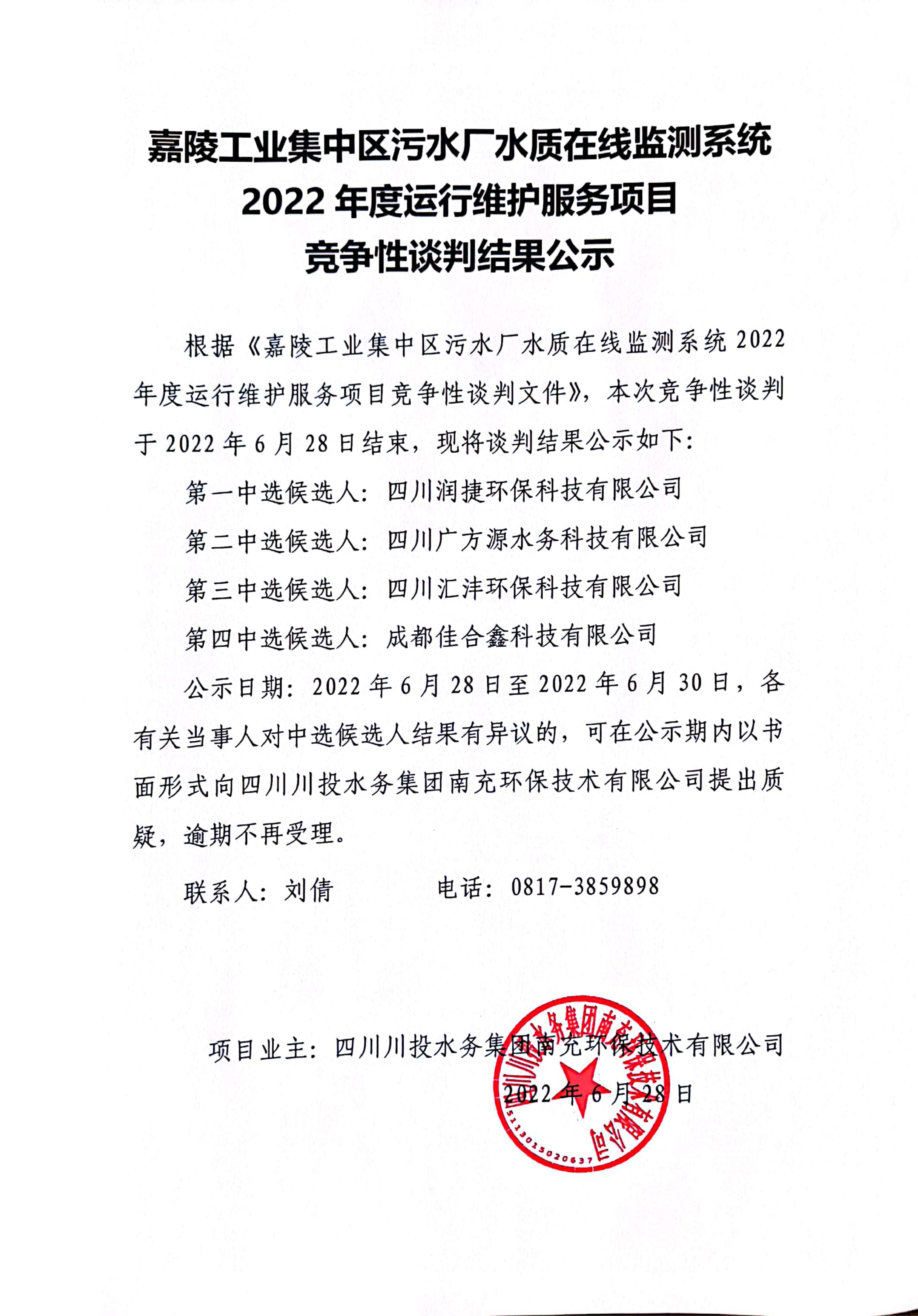 南充嘉陵工業(yè)集中區(qū)污水廠水質(zhì)在線監(jiān)測(cè)系統(tǒng)2022年度運(yùn)行維護(hù)服務(wù)項(xiàng)目競(jìng)爭(zhēng)性談判結(jié)果公示